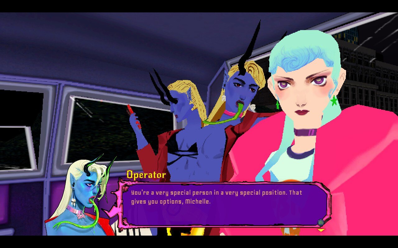 When the game starts, Michelle is longing for her ex who is now famous on the day’s hottest TV show. Amongst the cast of characters is The Operator who tells Michelle she can get back with her ex in exchange for obtaining a few scattered items around the game. The Operator also promises you revenge against The Duchess. Michelle has every reason to be upset at The Duchess, who kicked off Michelle’s adventure by granting her a third eye to see into heaven and hell. The Duchess has her own goals as she is desperate for love and continues to kidnap humans in a futile attempt to finally find a suitor.
